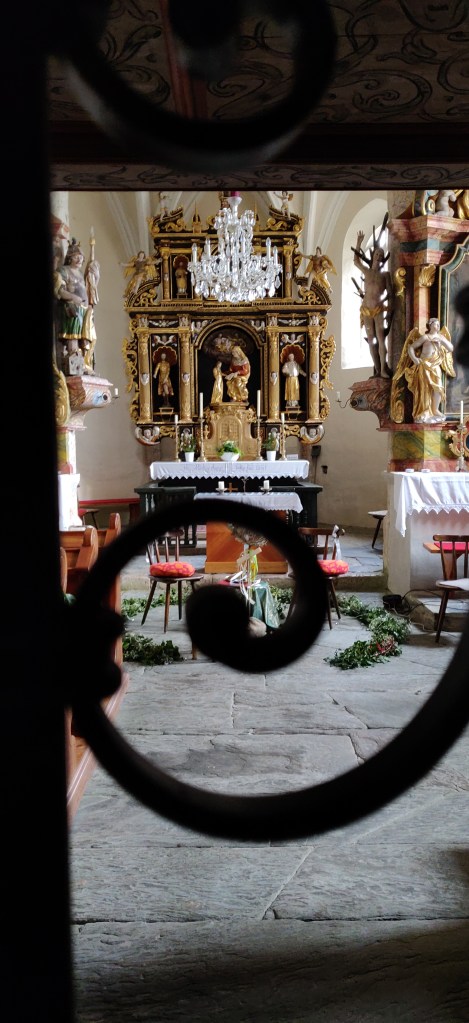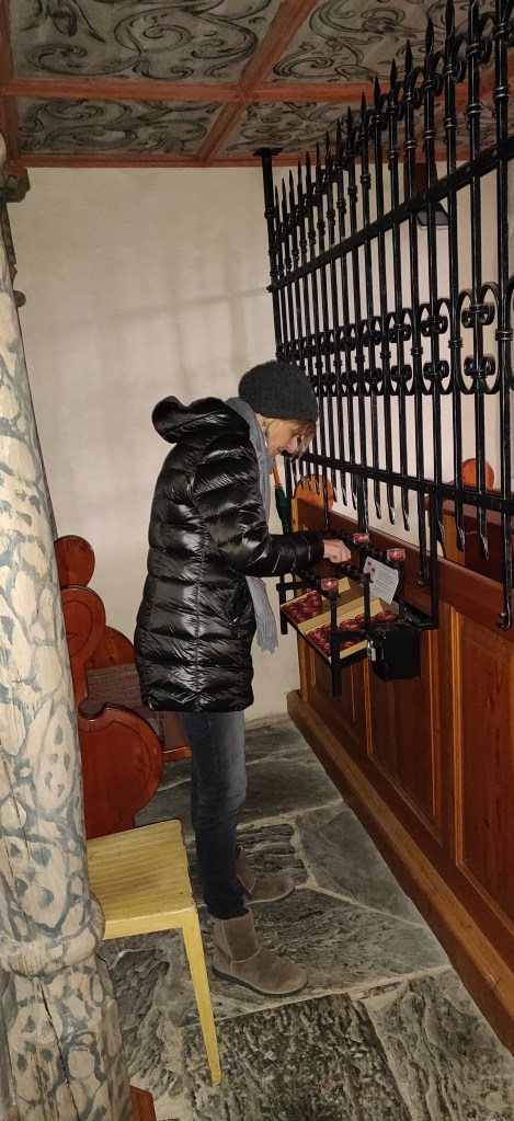 Weiter hinauf auf den Berg gaben wir uns ungeduldig der doch so leicht zu nutzenden Google-Map hin und gaben die St. Anna Kirche ein, und schwups standen wir auch schon vor ihr. Ein süßes kleines Kirchlein von außen, das jedoch innen mit einem doch großen Innenraum und Platz für kleinere Zeremonien bietet. Wir alle drei mochten die St. Anna Kirche auf Anhieb. Es breiteten sich trotz der Kälte eine Erstauntheit, Ruhe und Zufriedenheit in uns aus, dass man kurz die kühlen Temperaturen vergaß. Wir zündeten Kerzen an, warfen ein paar Euros ein und bewunderten das Innere der Kirche. Leider war sie zugesperrt, da man sich gegen Diebstahl absicherte (wie ein Schild verkündete, 1967 war dies leider in der Lindenbergkirche passiert).