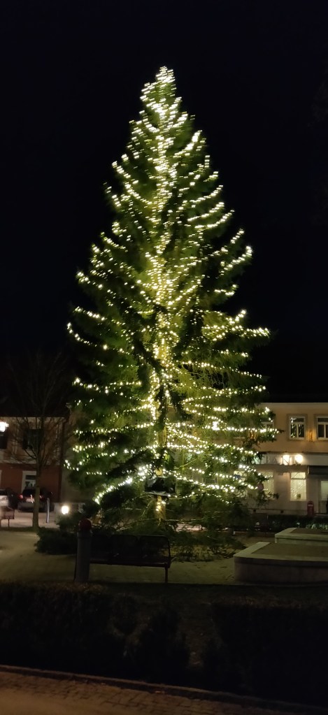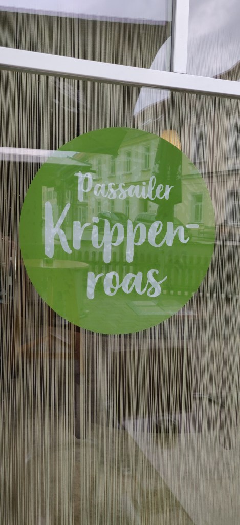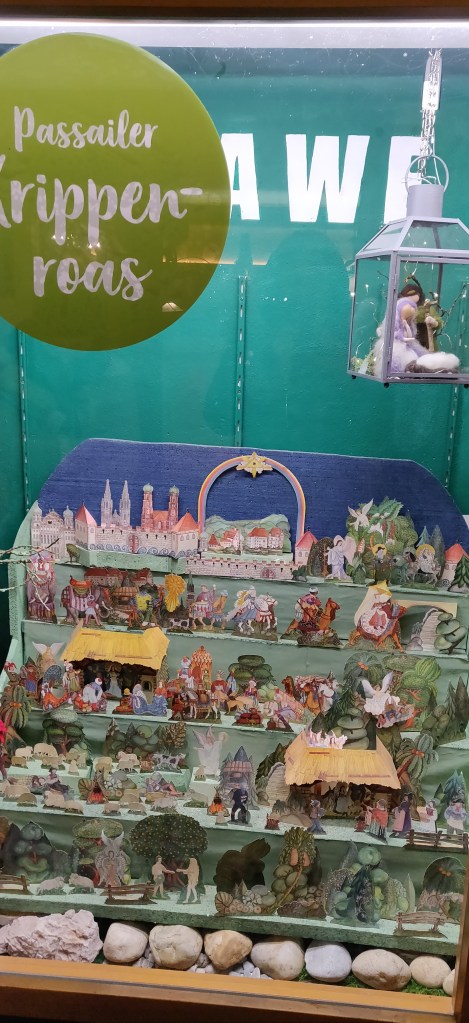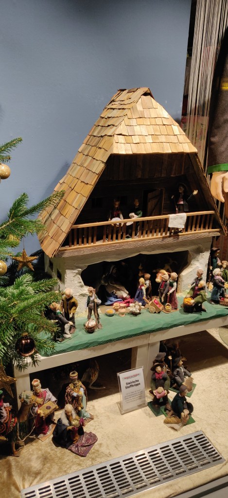 Gestärkt und gewärmt von den zahllosen Knödeln traten wir tapfer der Kälte entgegen und entdeckten nun die einzelnen Krippen in den Schaufenstern der Geschäftslokale rund um den Passailer Marktplatz. Wir waren jetzt auch eher in der Stimmung Krippen zu jagen, da sich die Dunkelheit eingestellt hatte und der riesige beleuchtete Weihnachtsbaum, der auf dem Marktplatz thronte, das Gefühl von Weihnachten in uns weckte. Wir schlenderten von einem Schaufenster zum anderen, betrachteten und fotografierten die einzelnen Krippen und lasen die Texte, die dabeistanden, laut vor. In der Bank ließen wir uns mehr Zeit, denn da war die Krippe im Raum und gab uns die Möglichkeit, uns wieder ein wenig aufzuwärmen.
