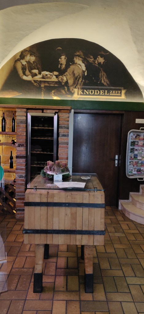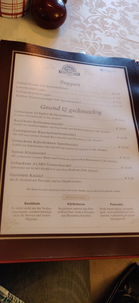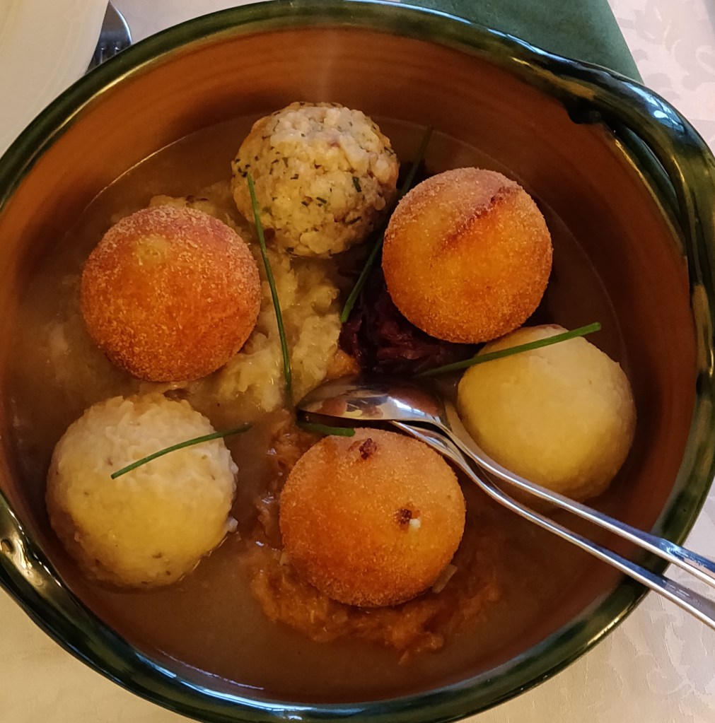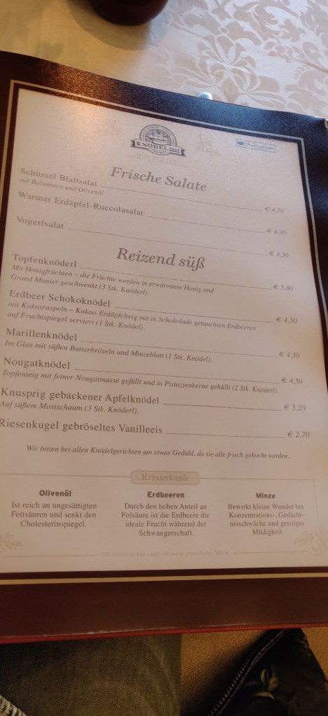 Im Almcafe lief wie erwartet die Formel I im Fernsehen und bereitete uns auf unser Pole-Position-Restaurant vor, auf uns wartete schließlich der reservierte Tisch im Gasthof Schrenk um 15.30 Uhr. Ein schnelles Getränk, ein freundschaftlicher Tratsch und schon waren wir wieder raus aus dem Almcafe und in knödeliger Erwartung unserer kulinarischen Verzückung. Und dem war auch so. Mein Favorit der kredenzten Knödel war der Salami-Knödel. Begleitet von einem guten Gespräch und einem Glas Zweigelt-Shiraz genossen wir verschiedene Knödel-Variationen. Wir arbeiteten uns von pikant bis süß vor. HERRLICH. Der Chef erzählte uns auch ein wenig von dem Gasthaus, dem Familienunternehmen und dem Auftritt des Familien-Teams beim Steirerfrühling in Wien am Rathausplatz, wo sage und schreibe ca. 4000 Knödel in 4 Tagen serviert wurden. In 7 Tiefkühltruhen lagerten die vorbereiteten Knödel. Was für ein Bild in meinem Kopf. Wahnsinn! Er gab uns etwas zu denken mit, als er uns fragte: „Könnt ihr euch vorstellen, wie viele Knödel und Tiefkühltruhen wir benötigen würden, wenn wir die Anfrage von der Organisation des Münchner Oktoberfests annehmen und dort Knödel anbieten würden?“ Ich bin bei der Kalkulation ausgestiegen, und ihr? Aber genial wäre es sicher, auf der Wiesn die Passailer Knödel zu schmausen. Aber warum so weit ziehen, wenn wir schon in Passail sind und dieses Vergnügen gleich live ausprobieren können? Ich sag nur eins, LECKER, ich komme wieder!