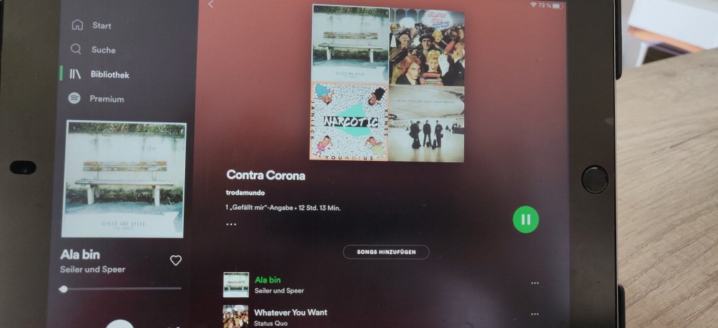 Zur Zeitüberbrückung sende ich euch meine Contra Corona-Playlist von der Musik-Plattform Spotify. Ihr müsst euch nicht einloggen, könnt es aber (kostenfrei, wenn ihr die Werbung ab und zu akzeptiert, ansonsten fällt ein Mitgliedsbeitrag an).