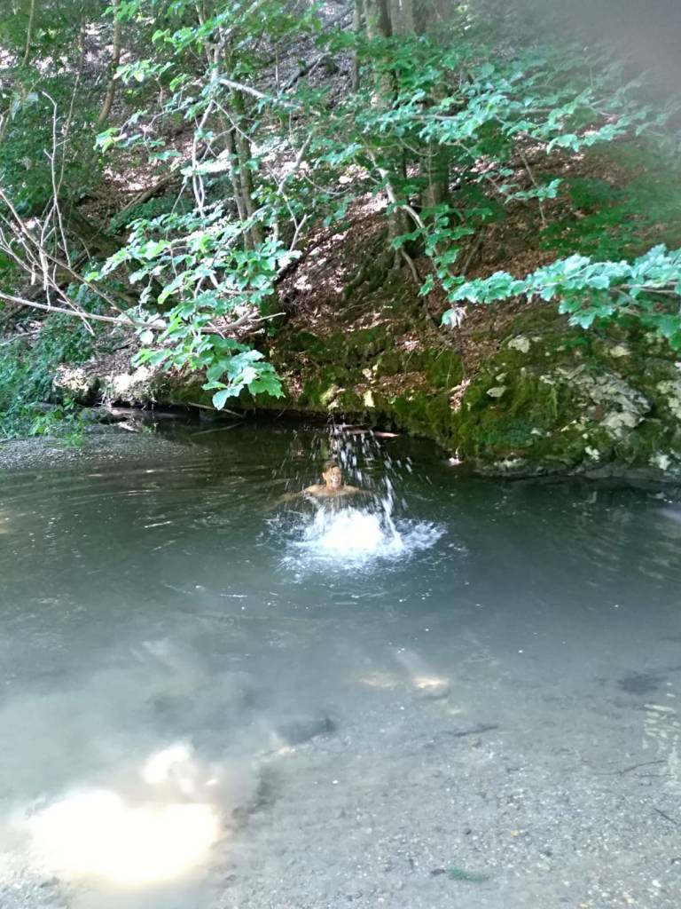 AHHH ein Traum. Wasser bis zum Hals, sitzend oder liegend auf den kleinen Kieseln oder auf dem Schlamm, die Strömung stark spürbar. Das hat sich ausgezahlt. Ich bin sehr erfrischt und bin voller Energie für den restlichen Weg. Die Wanderung geht weiter.