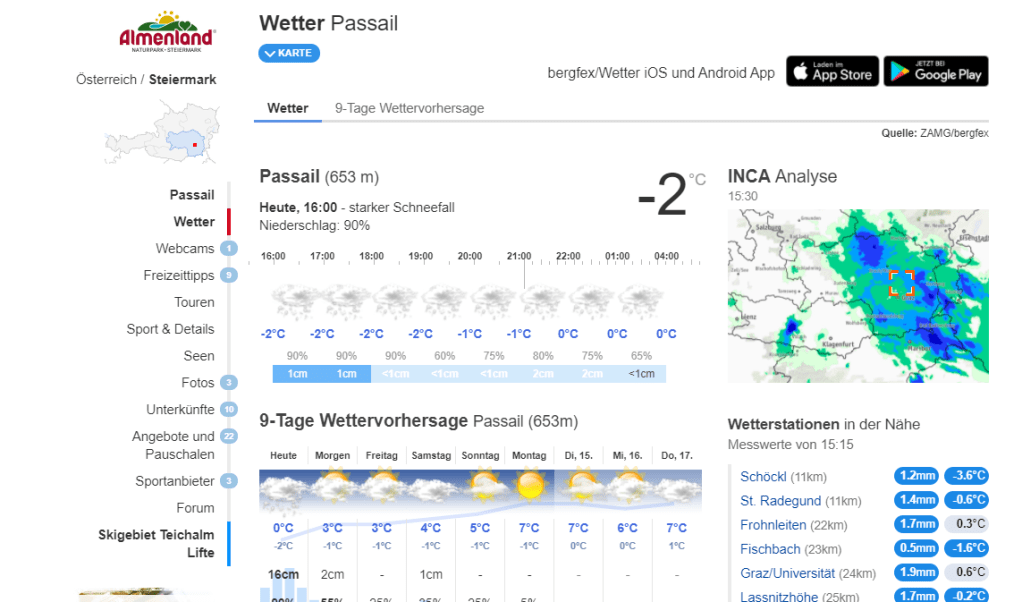 Ich, die Passail-Bloggerin, kann leider nur online das Passail-Wetter beobachten, denn auch in Graz herrscht „Schnee-Chaos“, wenn man das so nennen darf. Da wirkt mein warmer Arbeitsplatz mit Sicht auf den fallenden Schnee in Graz etwas verlockender als der Kampf mit den Schneeketten irgendwo da draußen.